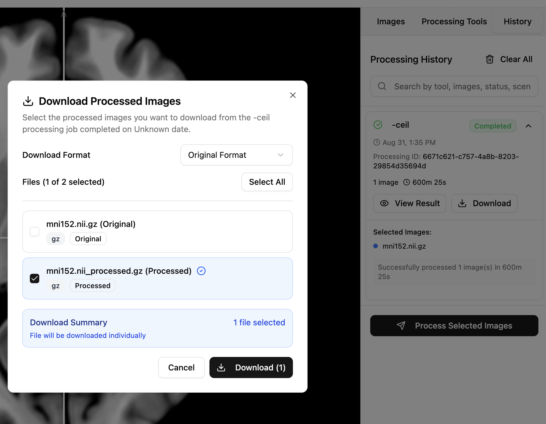 A big part of this project was making sure the user interface felt practical for people who actually work with neuroimaging data. Having Paul Wighton on board really helped here. The current implementation of the download feature is borrowed and inspired by Paul’s work — he highlighted that users should be able to download both the scene and the images straight from the browser. His guidance shaped the way we approached the UI, making it not just about visualization, but also about packaging results and keeping workflows portable.